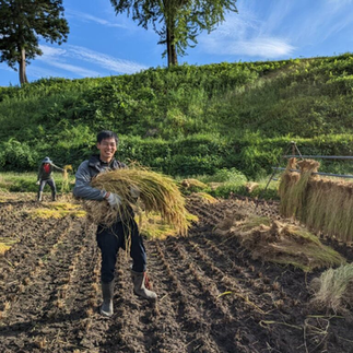 田植えと同じく、とまりいえは大型機械を使わず、ハゼかけという伝統的な方法でやります。